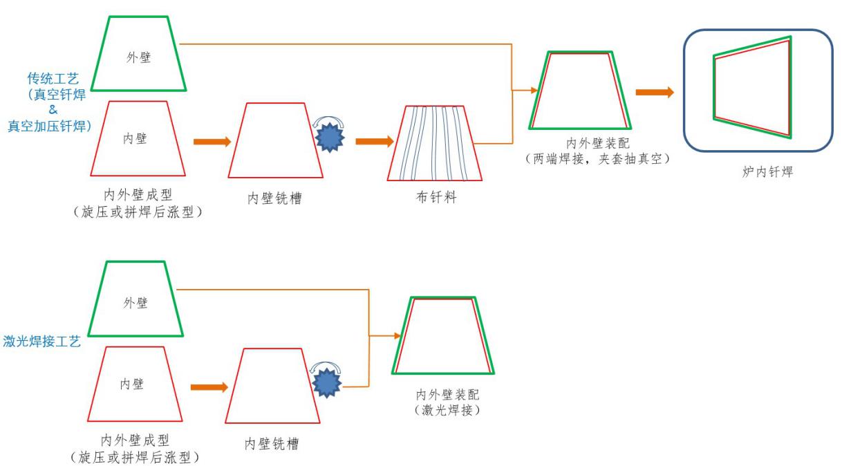 激光作為火箭發動機身部及噴管延伸段焊接方式有眾多優勢。傳統的火箭發動機噴管延伸段分為:再生冷卻式、輻射冷卻式、排放冷卻式、燒蝕冷風式。真空釬焊是銑槽式再生冷卻噴管夾層的常規焊接方法,此方式焊縫強度一般,操作流程復雜,焊接需在真空環境中進行,焊接過程難以實現自動化,且對操作人員技術水平要求較高。國內具有生產液體火箭發動機噴管能力的設備均為航天科技集團旗下的7103廠、211廠所擁有,制造周期長,生產成本高。經過分析與論證,激光焊接作為銑槽式再生冷卻噴管夾層結構焊接的首選,具有制造周期短,自動化程度高,環境要求低等眾多優勢,可大大縮短火箭發動機噴管研制周期(可壓縮至10h),降低噴管的制造成本,從而有效降低火箭的發射成本。