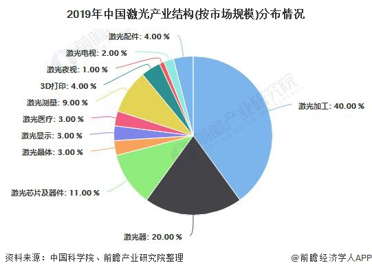 從激光產業的結構看,2019年激光加工版塊大幅領先,占比40%;其次為激光器,占比20% (來源:前瞻產業研究院)